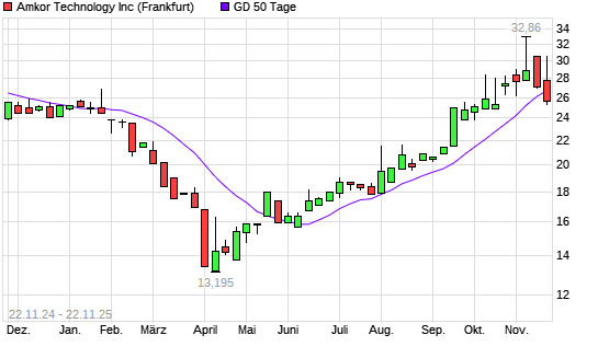 Mit dem Rücksetzer auf 25,67 EUR hat die Amkor-Aktie am 21.11.2025 die 50-Tage-Linie nach unten gekreuzt.