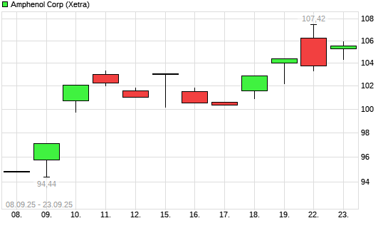 Mit dem Anstieg auf 105,12 EUR hat die Amphenol-Aktie (ISIN US0320951017) am 22.09.2025 ein neues All-Time-High erreicht und damit den Kurs vom 19.09.2025 eingestellt.