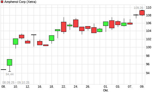 Mit dem Anstieg auf 107,76 EUR hat die Amphenol-Aktie (ISIN US0320951017) am 08.10.2025 ein neues All-Time-High erreicht und damit den Kurs vom 02.10.2025 eingestellt.