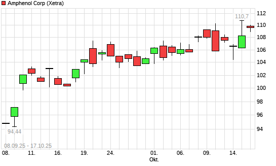 Mit dem Anstieg auf 109,50 EUR hat die Amphenol-Aktie (ISIN US0320951017) am 16.10.2025 ein neues All-Time-High erreicht und damit den Kurs vom 09.10.2025 eingestellt.