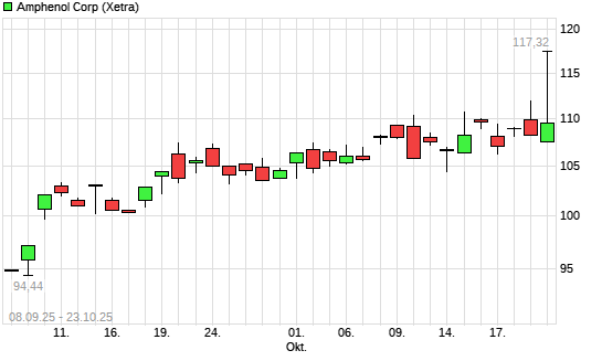Mit dem Anstieg auf 112,10 EUR hat die Amphenol-Aktie (ISIN US0320951017) am 22.10.2025 ein neues All-Time-High erreicht und damit den Kurs vom 16.10.2025 eingestellt.