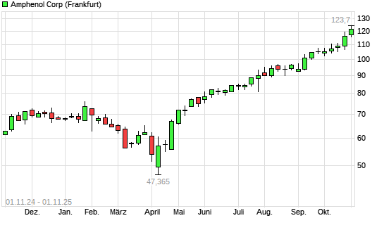 Mit dem Anstieg auf 121,24 EUR hat die Amphenol-Aktie (ISIN US0320951017) am 31.10.2025 ein neues All-Time-High erreicht und damit den Kurs vom 29.10.2025 eingestellt.