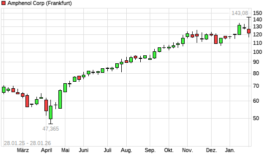 Mit dem Anstieg auf 136,76 EUR hat die Amphenol-Aktie (ISIN US0320951017) am 27.01.2026 ein neues All-Time-High erreicht und damit den Kurs vom 15.01.2026 eingestellt.