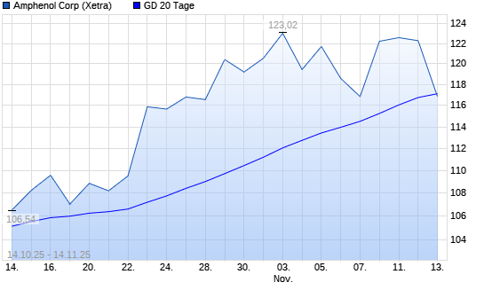 Mit dem Rücksetzer auf 116,78 EUR hat die Amphenol-Aktie am 13.11.2025 die 20-Tage-Linie nach unten gekreuzt.