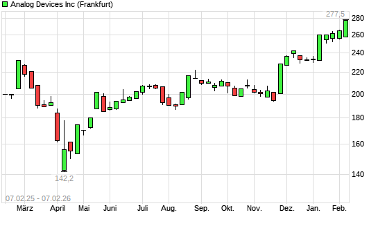 Mit dem Anstieg auf 277,50 EUR hat die Analog Devices-Aktie (ISIN US0326541051) am 06.02.2026 ein neues All-Time-High erreicht und damit den Kurs vom 05.02.2026 eingestellt.