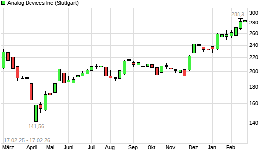 Mit dem Anstieg auf 286,40 EUR hat die Analog Devices-Aktie (ISIN US0326541051) am 16.02.2026 ein neues All-Time-High erreicht und damit den Kurs vom 12.02.2026 eingestellt.