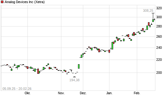 Mit dem Anstieg auf 294,70 EUR hat die Analog Devices-Aktie (ISIN US0326541051) am 19.02.2026 ein neues All-Time-High erreicht und damit den Kurs vom 18.02.2026 eingestellt.