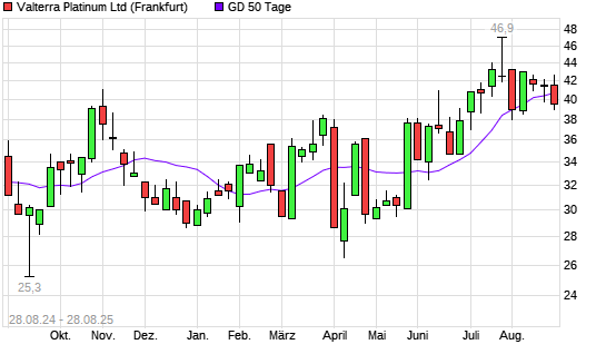 Mit dem Rücksetzer auf 39,40 EUR hat die Anglo Platinum-Aktie am 27.08.2025 die 50-Tage-Linie nach unten gekreuzt.