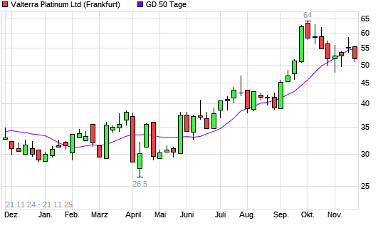 Mit dem Rücksetzer auf 54,40 EUR hat die Anglo Platinum-Aktie am 20.11.2025 die 50-Tage-Linie nach unten gekreuzt.