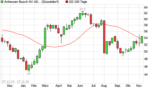 Mit dem Anstieg auf 54,00 EUR hat die Anheuser-Busch InBev ADR-Aktie am 06.11.2025 die 100-Tage-Linie nach oben gekreuzt.