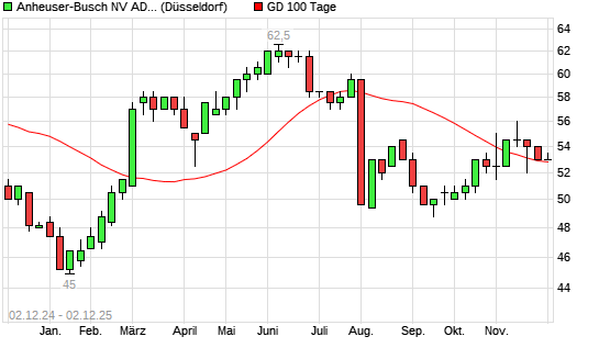 Mit dem Rücksetzer auf 52,00 EUR hat die Anheuser-Busch InBev ADR-Aktie am 01.12.2025 die 100-Tage-Linie nach unten gekreuzt.