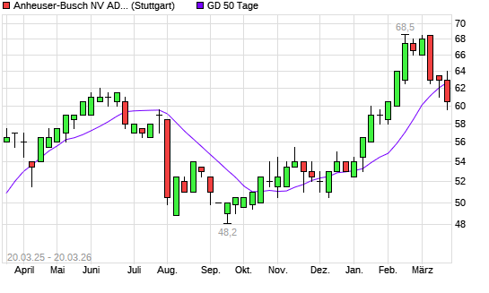 Mit dem Rücksetzer auf 60,00 EUR hat die Anheuser-Busch InBev ADR-Aktie am 19.03.2026 die 50-Tage-Linie nach unten gekreuzt.