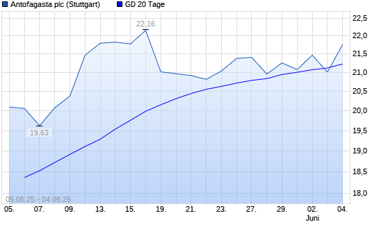 Mit dem Anstieg auf 21,43 EUR hat die Antofagasta-Aktie am 03.06.2025 die 20-Tage-Linie nach oben gekreuzt.