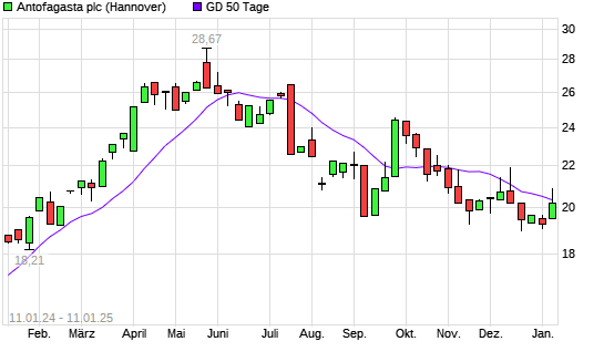 Mit dem Anstieg auf 21,00 EUR hat die Antofagasta-Aktie am 10.01.2025 die 50-Tage-Linie nach oben gekreuzt.