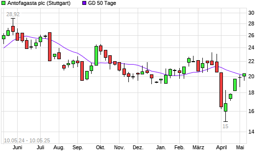 Mit dem Anstieg auf 20,37 EUR hat die Antofagasta-Aktie am 09.05.2025 die 50-Tage-Linie nach oben gekreuzt.
