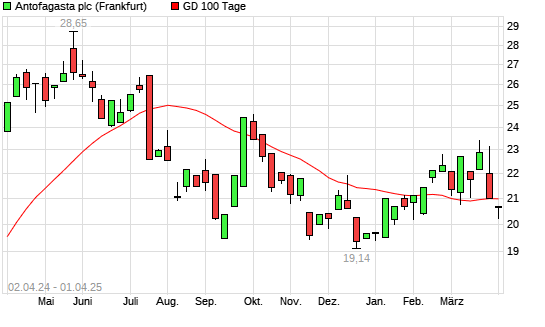 Mit dem Rücksetzer auf 20,65 EUR hat die Antofagasta-Aktie am 31.03.2025 die 100-Tage-Linie nach unten gekreuzt.