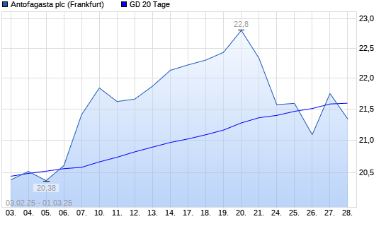 Mit dem Rücksetzer auf 21,34 EUR hat die Antofagasta-Aktie am 28.02.2025 die 20-Tage-Linie nach unten gekreuzt.