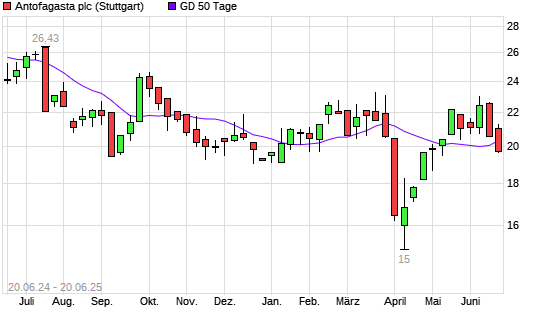 Mit dem Rücksetzer auf 20,45 EUR hat die Antofagasta-Aktie am 19.06.2025 die 50-Tage-Linie nach unten gekreuzt.