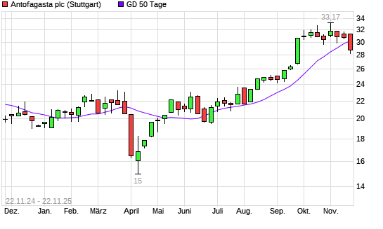 Mit dem Rücksetzer auf 28,99 EUR hat die Antofagasta-Aktie am 21.11.2025 die 50-Tage-Linie nach unten gekreuzt.