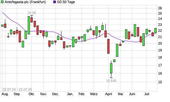 Mit dem Anstieg auf 21,62 EUR hat die Antofagasta-Aktie am 21.07.2025 die 50-Tage-Linie nach oben gekreuzt.Die Antofagasta-Aktie befindet sich seit dem 27.06.2025 im langfristigen Aufwärtstrend ...weiterlesen