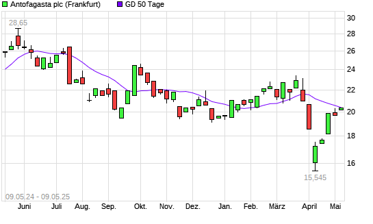 Mit dem Rücksetzer auf 20,20 EUR hat die Antofagasta-Aktie am 08.05.2025 die 50-Tage-Linie nach unten gekreuzt.Die Antofagasta-Aktie befindet sich seit dem 28.03.2025 im langfristigen Abwärtstrend ...weiterlesen