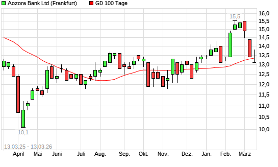 Mit dem Rücksetzer auf 13,10 EUR hat die Aozora Bank-Aktie am 12.03.2026 die 100-Tage-Linie nach unten gekreuzt.