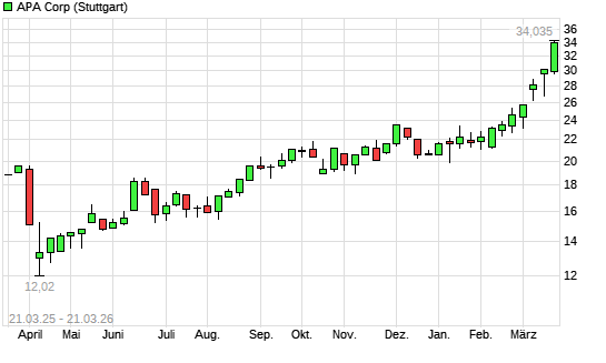 Mit dem Anstieg auf 34,29 EUR hat die Apache-Aktie (ISIN US03743Q1085) am 20.03.2026 ein neues 12-Monats-Hoch erreicht und damit den Kurs vom 19.03.2026 eingestellt.