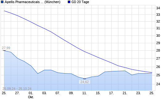 Mit dem Rücksetzer auf 24,27 EUR hat die Apellis Pharmaceuticals-Aktie am 24.10.2024 die 20-Tage-Linie nach unten gekreuzt.
