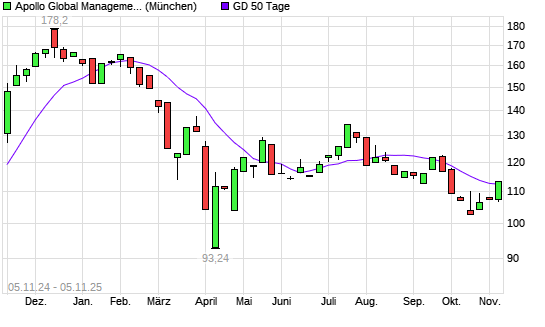 Mit dem Anstieg auf 113,45 EUR hat die Apollo Global Management-Aktie am 04.11.2025 die 50-Tage-Linie nach oben gekreuzt.