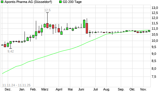 Mit dem Rücksetzer auf 10,70 EUR hat die Apontis Pharma-Aktie am 10.11.2025 die 200-Tage-Linie nach unten gekreuzt.