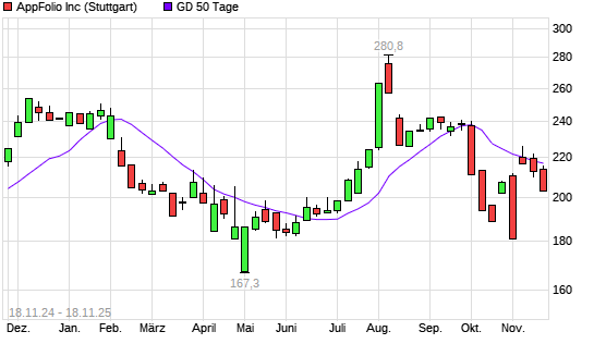 Mit dem Anstieg auf 218,20 EUR hat die AppFolio-Aktie am 17.11.2025 die 50-Tage-Linie nach oben gekreuzt.