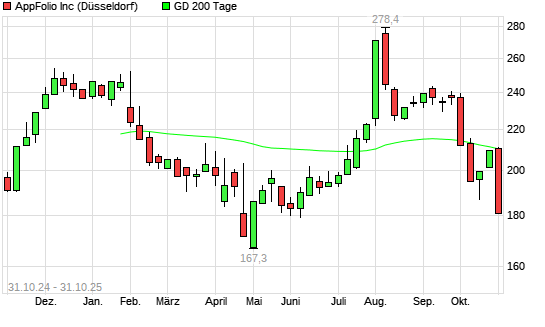 Mit dem Rücksetzer auf 205,80 EUR hat die AppFolio-Aktie am 30.10.2025 die 200-Tage-Linie nach unten gekreuzt.