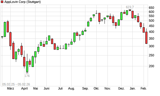 Mit dem Rücksetzer auf 323,65 EUR hat die AppLovin-Aktie (ISIN US03831W1080) am 04.02.2026 ein neues 6-Monats-Tief erreicht und damit den Kurs vom 05.08.2025 eingestellt.
