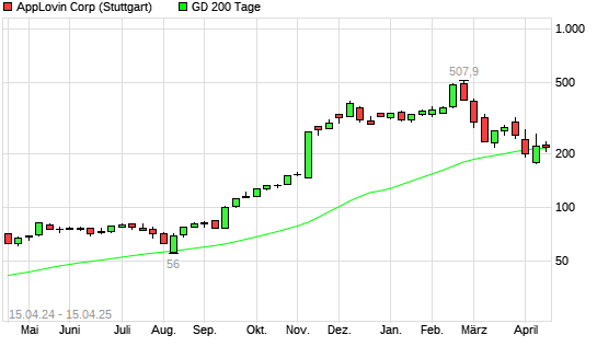 Mit dem Rücksetzer auf 207,90 EUR hat die AppLovin-Aktie am 14.04.2025 die 200-Tage-Linie nach unten gekreuzt.