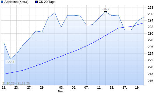 Mit dem Rücksetzer auf 230,90 EUR hat die Apple-Aktie am 20.11.2025 die 20-Tage-Linie nach unten gekreuzt.