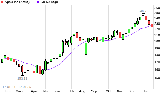 Mit dem Rücksetzer auf 221,55 EUR hat die Apple-Aktie am 16.01.2025 die 50-Tage-Linie nach unten gekreuzt.