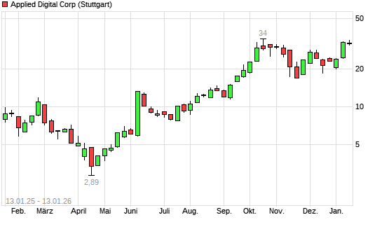 Mit dem Anstieg auf 33,70 EUR hat die Applied Digital-Aktie (ISIN US0381692070) am 12.01.2026 ein neues All-Time-High erreicht und damit den Kurs vom 16.10.2025 eingestellt.