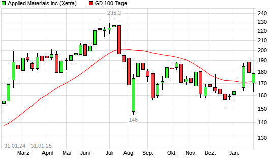 Mit dem Anstieg auf 174,80 EUR hat die Applied Materials-Aktie am 30.01.2025 die 100-Tage-Linie nach oben gekreuzt.