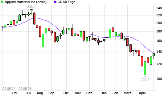 Mit dem Anstieg auf 137,92 EUR hat die Applied Materials-Aktie am 02.05.2025 die 50-Tage-Linie nach oben gekreuzt.