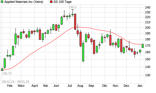 Mit dem Rücksetzer auf 169,90 EUR hat die Applied Materials-Aktie am 08.01.2025 die 100-Tage-Linie nach unten gekreuzt.