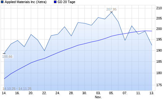 Mit dem Rücksetzer auf 196,20 EUR hat die Applied Materials-Aktie am 13.11.2025 die 20-Tage-Linie nach unten gekreuzt.