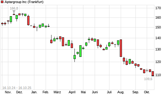 Mit dem Rücksetzer auf 111,40 EUR hat die AptarGroup-Aktie (ISIN US0383361039) am 15.10.2025 ein neues 12-Monats-Tief erreicht und damit den Kurs vom 24.09.2025 eingestellt.