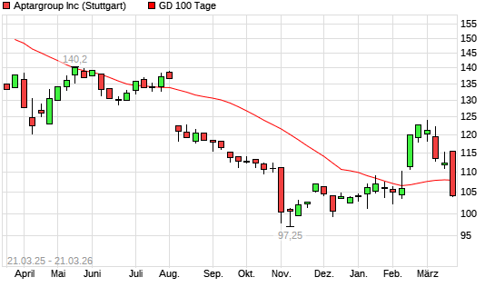 Mit dem Rücksetzer auf 106,90 EUR hat die AptarGroup-Aktie am 20.03.2026 die 100-Tage-Linie nach unten gekreuzt.