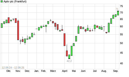 Mit dem Anstieg auf 71,00 EUR hat die Aptiv-Aktie (ISIN JE00BTDN8H13) am 11.09.2025 ein neues 12-Monats-Hoch erreicht und damit den Kurs vom 10.09.2025 eingestellt.