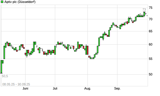 Mit dem Anstieg auf 73,00 EUR hat die Aptiv-Aktie (ISIN JE00BTDN8H13) am 29.09.2025 ein neues 12-Monats-Hoch erreicht und damit den Kurs vom 19.09.2025 eingestellt.