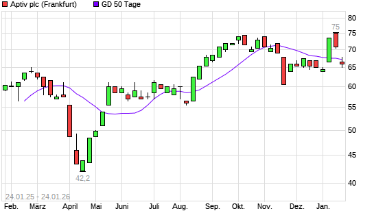 Mit dem Rücksetzer auf 66,00 EUR hat die Aptiv-Aktie am 23.01.2026 die 50-Tage-Linie nach unten gekreuzt.