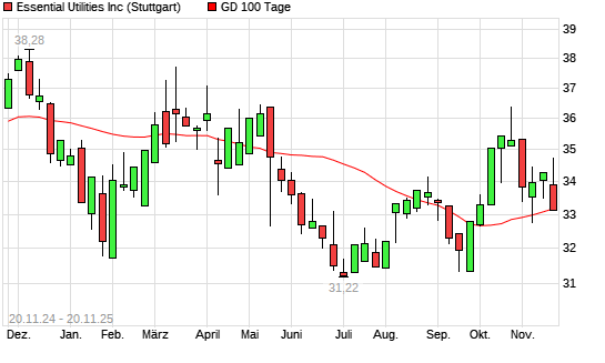 Mit dem Rücksetzer auf 33,02 EUR hat die Aqua America-Aktie am 19.11.2025 die 100-Tage-Linie nach unten gekreuzt.