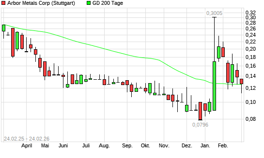 Mit dem Rücksetzer auf 0,12 EUR hat die Arbor Metals-Aktie am 23.02.2026 die 200-Tage-Linie nach unten gekreuzt.