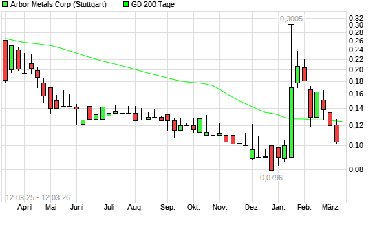 Mit dem Rücksetzer auf 0,11 EUR hat die Arbor Metals-Aktie am 11.03.2026 die 200-Tage-Linie nach unten gekreuzt.