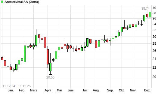 Mit dem Anstieg auf 38,33 EUR hat die ArcelorMittal-Aktie (ISIN LU1598757687) am 10.12.2025 ein neues 10-Jahres-Hoch erreicht und damit den Kurs vom 01.12.2025 eingestellt.